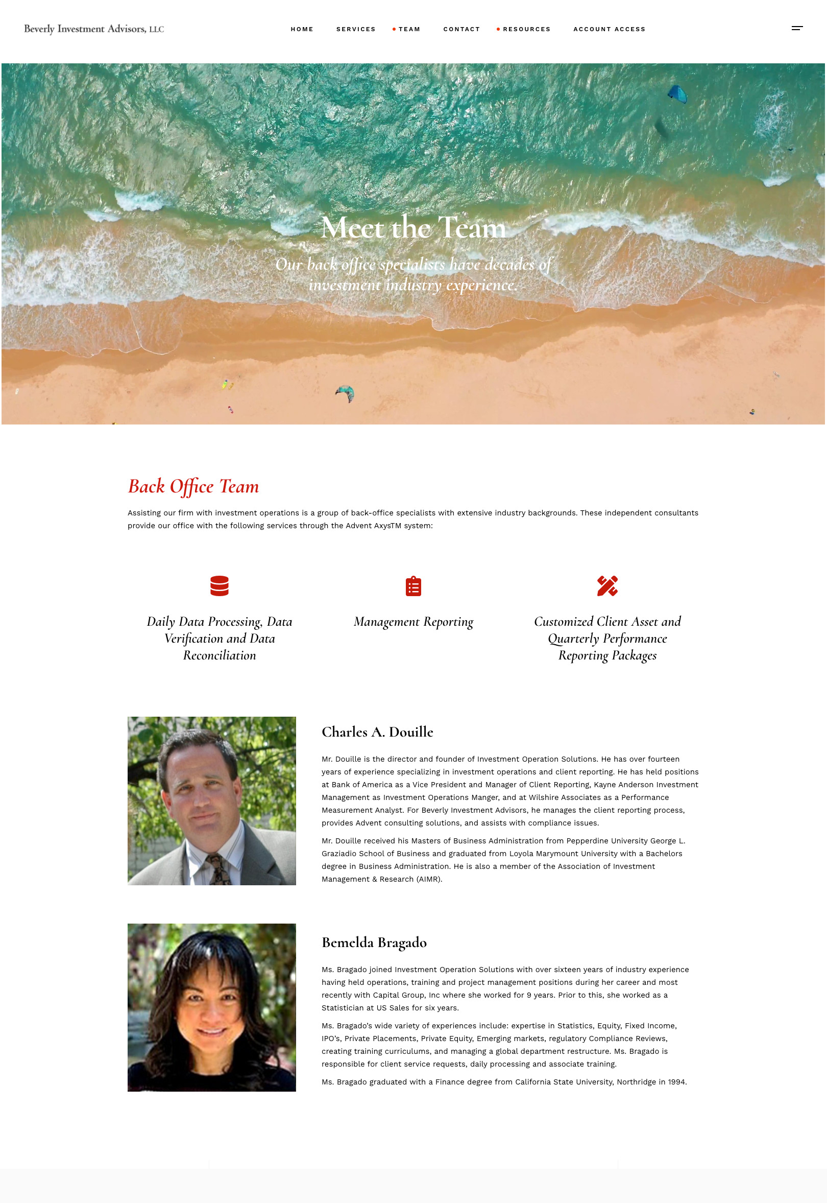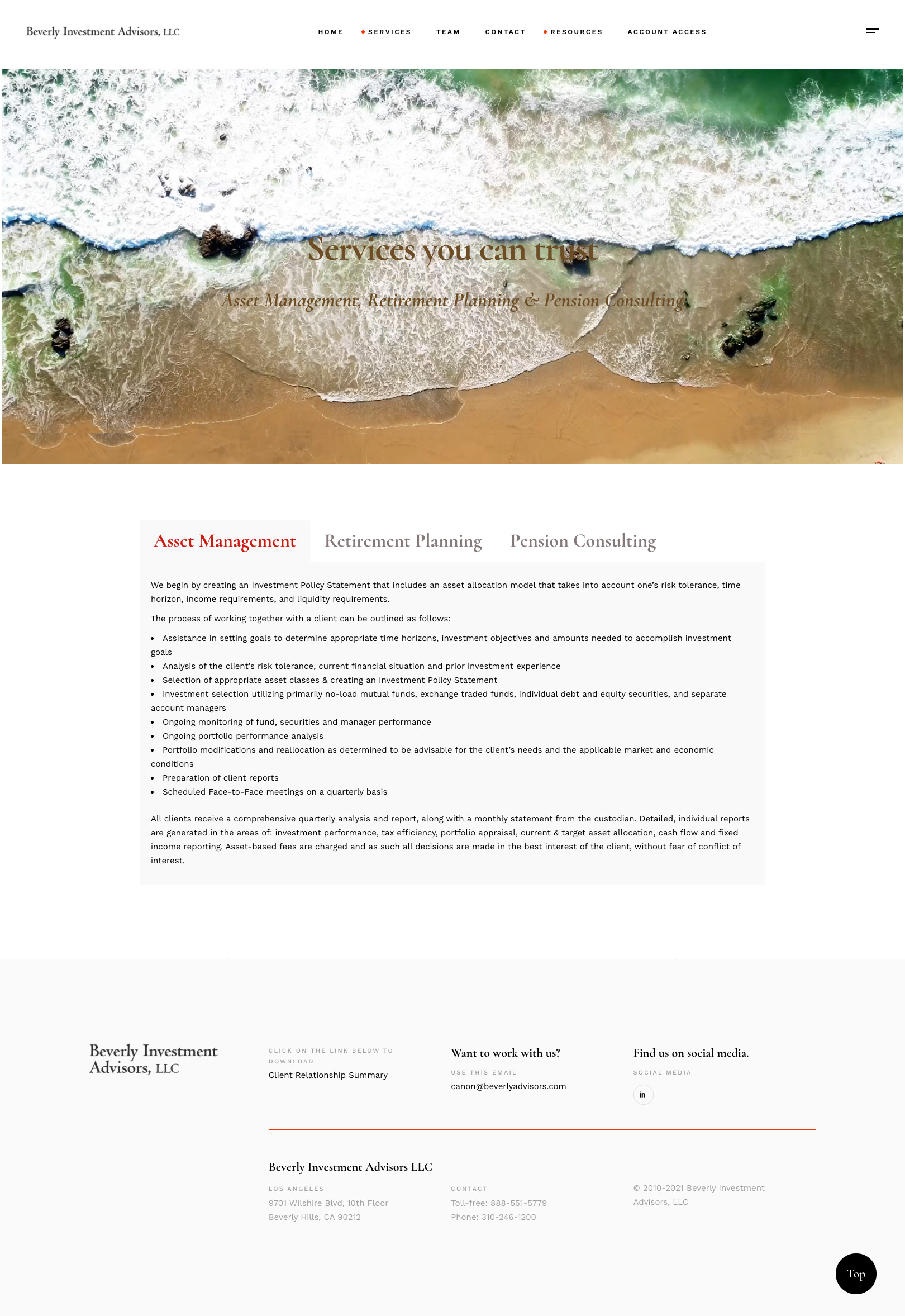 We were engaged by Canon Price, Founder and Principal of Beverly Advisors to re-design their corporate website. The firm provides independent, objective advice regarding asset management, retirement planning and pension consulting for high net-worth individuals and corporate entities.